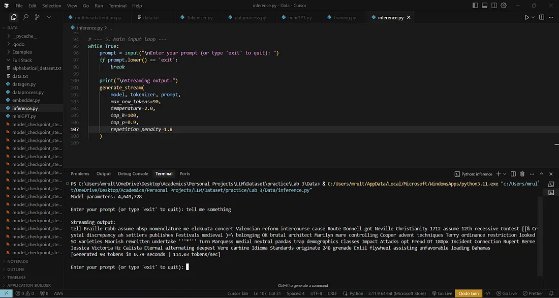 For inference, I sampled 20 tokens at a time to get a feel for the learning trajectory. This revealed whether the model was overfitting, memorizing, or genuinely learning language patterns.